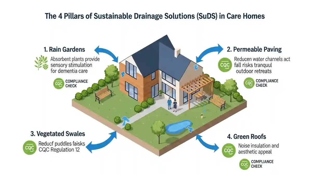 The future of sustainable drainage solutions CQC care home design is the integration of SuDS (Sustainable Drainage Systems). In Petts wood, Policy EN18 of the Local Plan encourages SuDS to manage surface water runoff, which often plagues the surrounding area.
